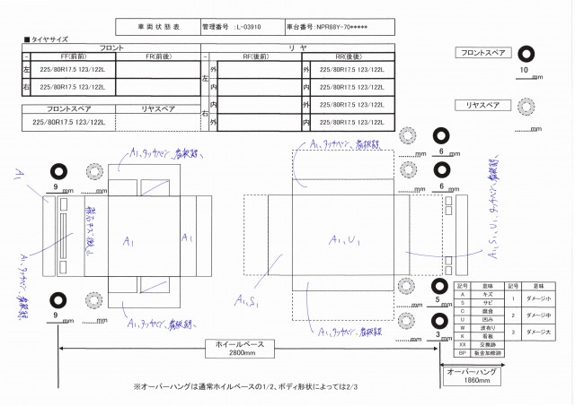 ▲フロントガラス:飛石キズ微小程度 ▲キャビン外装:タッチペン、薄い看板跡 ▲キャビン内装:スリキズ、内張りの一部色あせ ▲下回り・シャーシ:サビ小、サビ跡 ▲マフラー:サビ有り ▲ボディ外装:キズ・サビ・凹み小、薄い看板跡、タッチペン ▲ボディ庫内:キズ・サビ跡、凹み小複数 ▲プレス板・スライド板:キズ・サビ跡、凹み複数 ▲排出板:キズ・サビ跡・一部凹み・反り有り ※他、詳細はお問い合わせ下さい