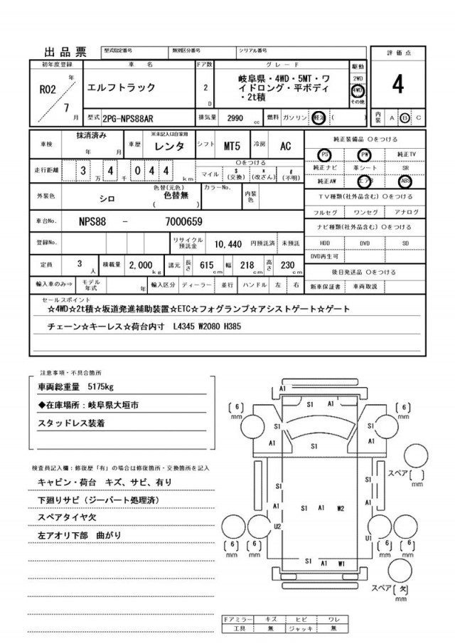 ☆4WD☆2t積☆坂道発進補助装置☆ETC☆フォグランプ☆アシストゲート☆ゲートチェーン☆キーレス☆荷台内寸 L4345 W2080 H385