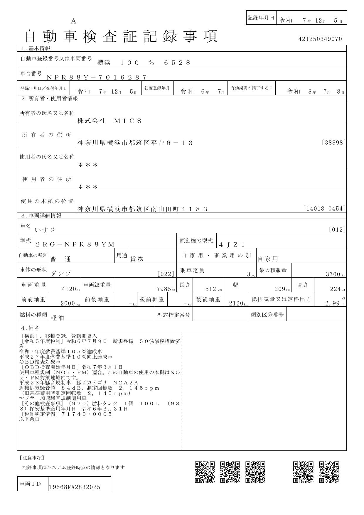 ★未使用車【車検付き/ワイド/3.7t積載】 ★スライド式ダンプ【花見台製(35122)/中間ピン】★装備【バックモニター】
