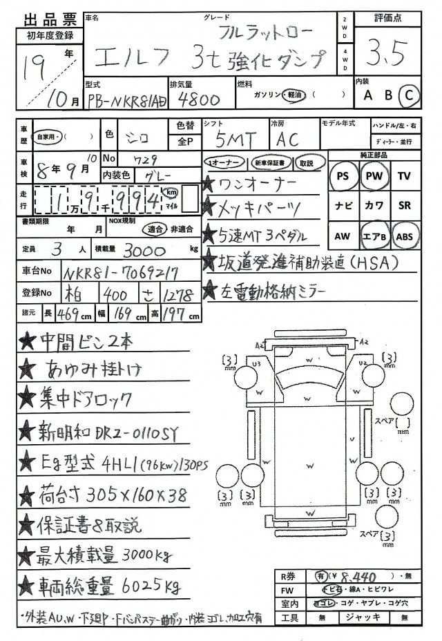 ワンオーナー メッキパーツ 5速MT3ペダル 坂道発進補助装置 左電格ミラー 中間ピン2本 あゆみ掛け 集中ドアロック 新明和DR2-0110SY Eg型式4HL1 130ps 荷台寸305-160-38 保証書&取説 最大積載量3000キロ 車両総重量6025キロ