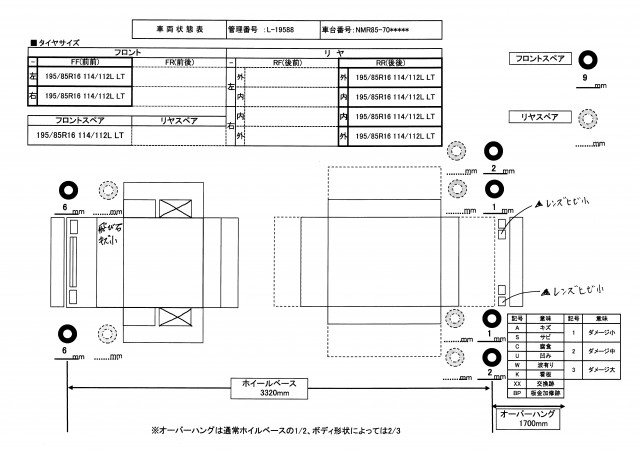 ▲フロントガラス:飛石キズ微小 ▲ミラーカバー:スリキズ小 ▲キャビン外装:スリキズ小 ▲キャビン内装:スリキズ小、ドア内張日焼け、ハンドル擦れ ▲リヤテールランプ:レンズヒビ小複数 ▲エンジン:一部オイルにじみ小 ▲下回り・シャーシ:一部サビ跡 ▲マフラー:サビ ▲タイヤ後輪4本:溝少ない、劣化・・・◎交換推奨◎ ※他、詳細はお問い合わせください