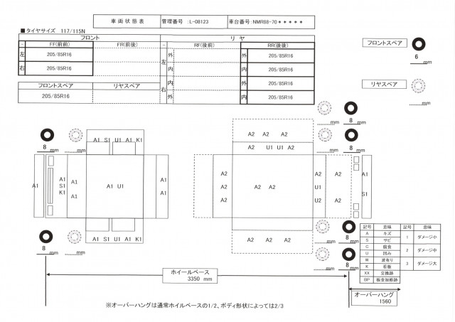 ▲フロントガラス:飛石キズ微小程度有り ▲サイドミラーカバー左右:スリキズ小 ▲キャビン外装:キズ、サビ、凹み小、看板跡小 ▲キャビン内装:キズ汚れ小、灰皿欠品、部品取り外し跡 ▲ハンドル・シフト:擦れ汚れ小 ▲下廻り・マフラー:サビ小 ▲幌シート:擦れ・汚れ・切れ小 ▲あおり内側:キズ小・凹み小 ▲リヤあおり:左ロックレバー部押され・凹み ※他、詳細はお問い合わせください