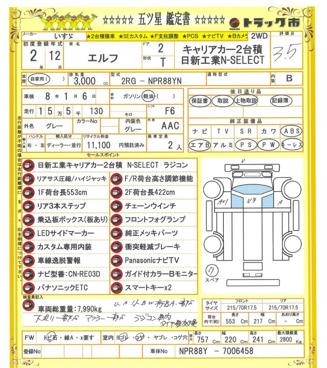 ☆日新工業キャリアカー☆2台積み☆ラジコン☆リアサス圧縮☆ハイジャッキ☆F/R荷台高さ調節機能☆チェーンウインチ☆リア3本ステップ☆LEDサイドマーカー☆純正メッキ☆カスタム専用内装☆衝突被害軽減ブレーキ☆ナビTV☆Bモニター☆ETC☆スマートキー☆記録簿後送☆
