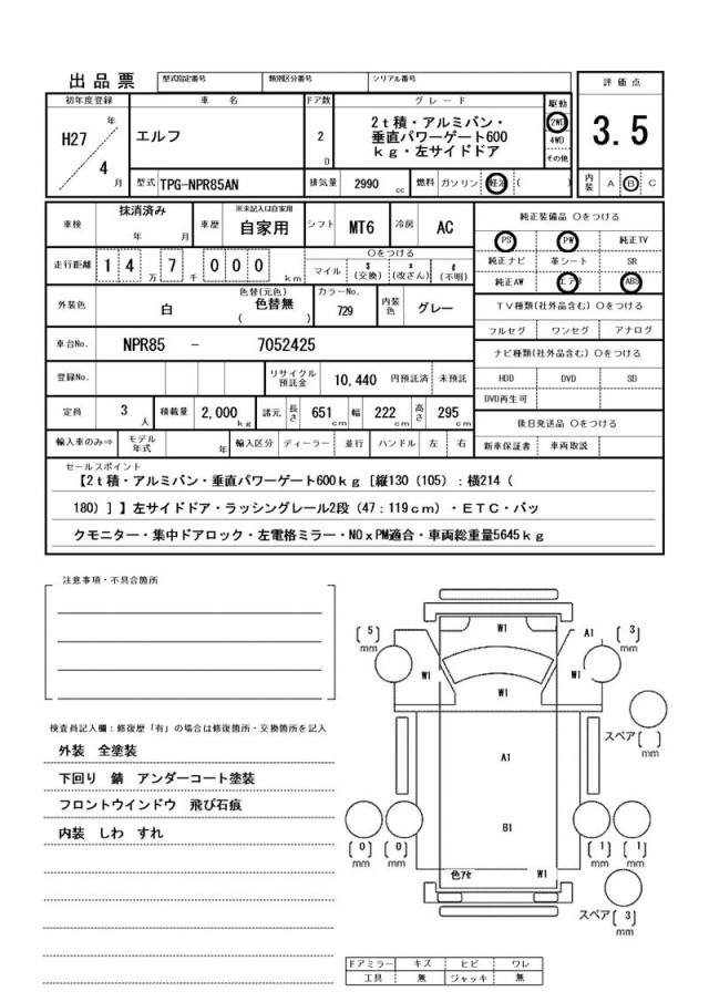 【2t積・アルミバン・垂直パワーゲート600kg[縦130(105):横214(180)]】・左サイドドア・ラッシングレール2段(47:119cm)・ETC・バックモニター・集中ドアロック・左電格ミラー・NOxPM適合・車両総重量5645kg