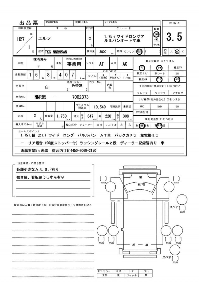 1.75t積 ワイド ロング パネルバン オートマ車 バックカメラ 左電格ミラー リア観音(90度ストッパー付)ラッシングレール2段 ディーラー記録簿有り 車両総重量5t未満