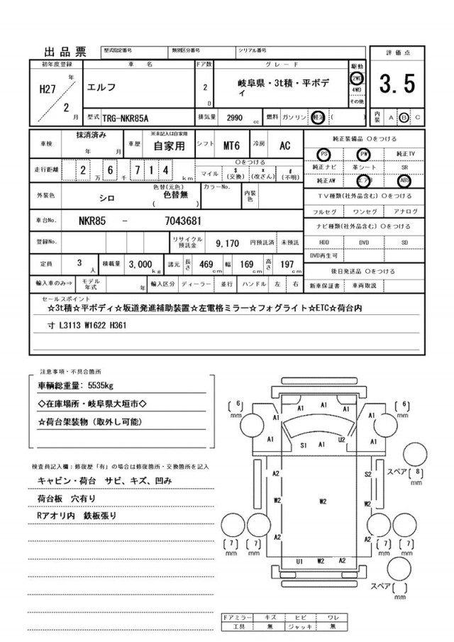 ☆3t積☆平ボディ☆坂道発進補助装置☆左電格ミラー☆フォグライト☆ETC☆荷台内寸 L3113 W1622 H361