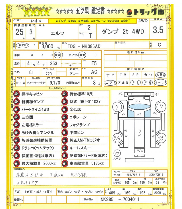 ☆新明和ダンプ☆標準キャビン☆荷台標準10尺☆パートタイム4WD☆全低床☆三方開☆コボレーン☆左電格ミラー☆フォグランプ☆中間ピン☆あゆみ掛けアングル☆坂道補助装置☆純正ラジオ☆ドラレコ☆キーレス☆保証書・取説・記録簿H27~R6(車内)☆