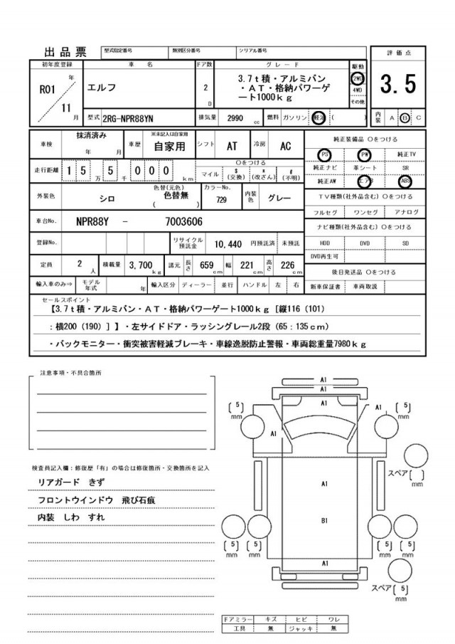 【3.7t積・アルミバン・AT・格納パワーゲート1000kg[縦116(101):横200(190)]】・左サイドドア・ラッシングレール2段(65:135cm)・バックモニター・衝突被害軽減ブレーキ・車線逸脱防止警報・集中ドアロック・左電格ミラー・NOxPM適合・車両総重量7980kg