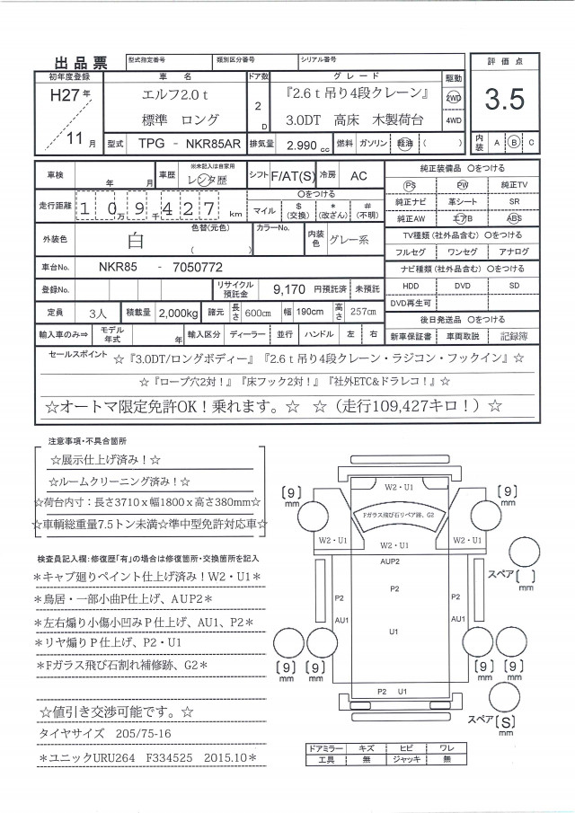 ☆H27年エルフ2.0t『ロング』高床『2.6t吊り4段クレーン・ラジコン・フックイン』木製荷台☆(走行109,427キロ!)『ロープ穴2対』『床フック2対』『社外ETC&ドラレコ』☆車輌総重量7.5トン未満☆準中型免許対応車☆オートマ限定免許OK!乗れます。☆遠方の方でも安心!ルームクリーニング済み!☆展示仕上げ済み!☆