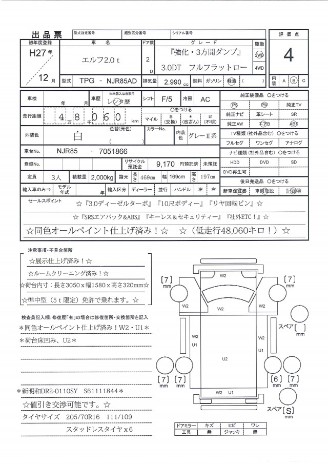 ☆H27年エルフ2.0tフルフラットロー『強化・3方開ダンプ』10尺ボディー(低走行48,060キロ)☆『同色オールペイント仕上げ済み!』『リヤ回転ピン』『キーレス&セキュリティー』『社外ETC!』☆準中型(5t限定)免許で乗れます。☆遠方の方でも安心!ルームクリーニング済み!☆展示仕上げ済み!☆