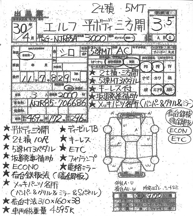 ★平ボディ ★2トン積 ★三方開 ★10尺 ★5速MT3ペダル ★キーレス ★坂道発進補助装置 ★メッキパーツ各所付! ★荷台鉄板張り縞鋼板 ★電格ミラー ★ETC ★ECONO ★フォグL ★バイザーマット ★荷台寸法310-160-38