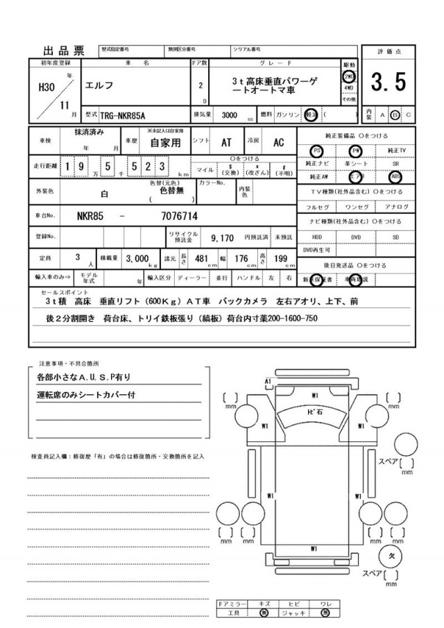 3t積 高床 垂直リフト(600Kg)オートマ車 バックカメラ 左右アオリ上下、前後2分割開き 荷台床、トリイ鉄板張り(縞板)