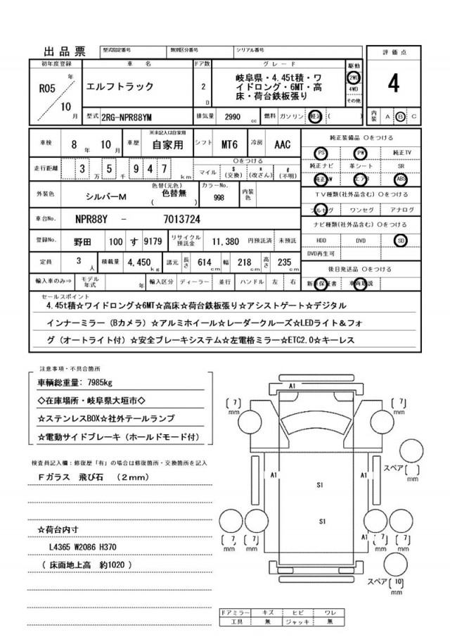 ☆4.45t積☆ワイドロング☆6MT☆高床☆荷台鉄板張り☆アシストゲート☆デジタルインナーミラー(Bカメラ)☆アルミホイール☆レーダークルーズ☆LEDライト&フォグ(オートライト付) ☆安全ブレーキシステム☆左電格ミラー☆ETC2.0☆キーレス ☆電動サイドブレーキ(ホールドモード付)☆ステンレスBOX☆社外テールランプ ☆荷台内寸L4365 W2086 H370 ( 床面地上高 約1020 )