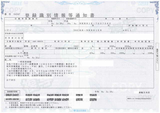 | 車検 | 抹消 |