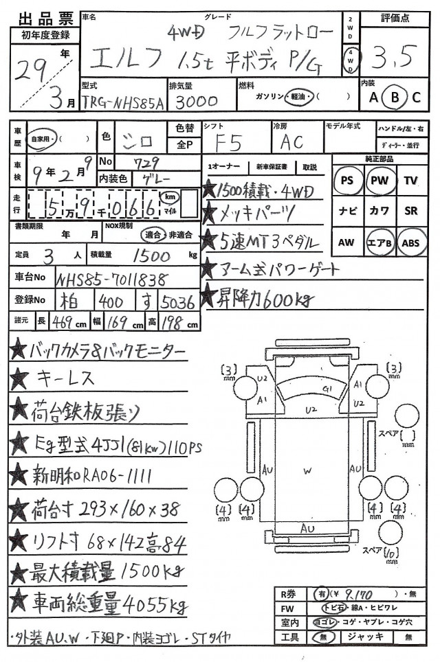 1500キロ積載 4WD 5速MT メッキパーツ アーム式パワーゲート 昇降力600キロ バックカメラ&モニター キーレス 荷台鉄板 4JJ1 110ps 新明和RA06-1111 荷台寸293-160-38 リフト寸68-142高84 最大積載量1500キロ 車両総重量4055キロ