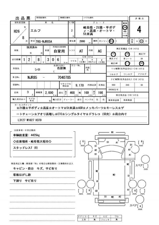 スタッドレスT(R)・キャビン・荷台 キズ、サビ有り・看板はがし跡・下廻り サビ有り