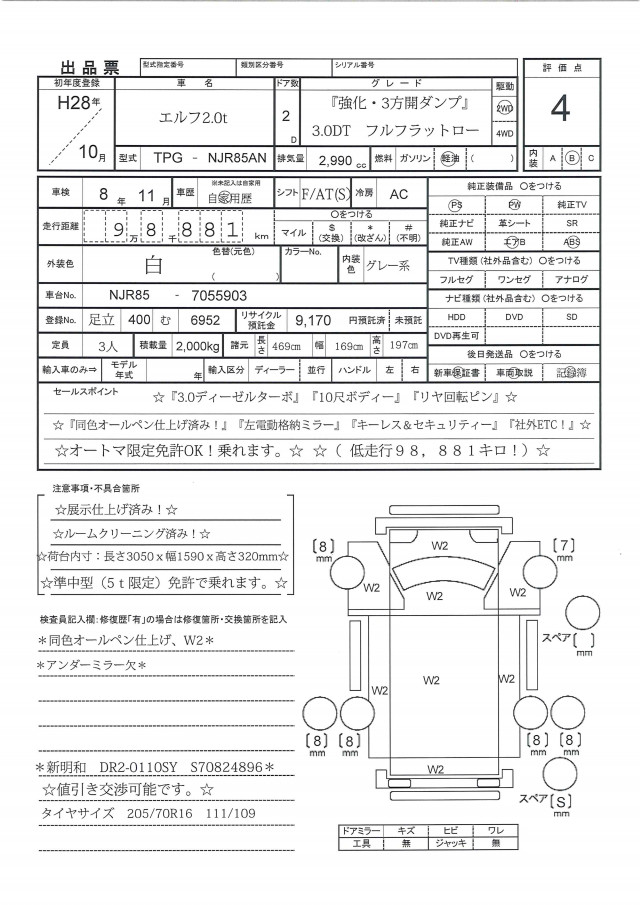 ☆H28年エルフ2.0tフルフラットロー『強化・3方開ダンプ』10尺ボディー☆(低走行98,881キロ!)『リヤ回転ピン』『同色オールペン仕上げ!』『キーレス&セキュリティー』『左電動格納ミラー』『社外ETC&ドラレコ』☆準中型(5t限定)免許で乗れます。☆遠方の方でも安心!ルームクリーニング済み!☆展示仕上げ済み!☆