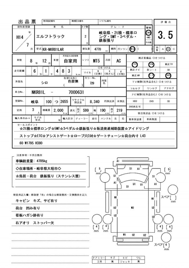 ☆2t積☆標準ロング☆5MT☆3ペダル☆鉄板張り☆坂道発進補助装置☆アイドリングストップ☆ETC☆アシストゲート☆ロープ穴3対☆ゲートチェーン☆荷台内寸 L4360 W1795 H380 ☆鳥居・荷台 鉄板張り(ステンレス製)