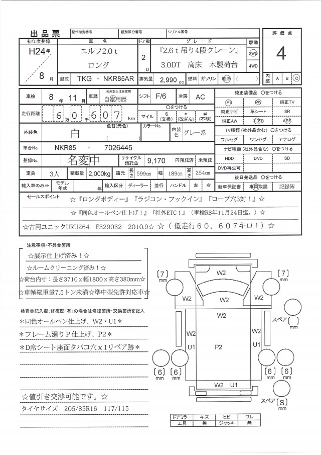 ☆H24年エルフ2.0t『ロング』高床『2.6t吊り4段クレーン・ラジコン・フックイン』木製荷台・ロープ穴3対☆(低走行60,607キロ!)(車検R8年11月24日迄。)☆『同色オールペイント仕上げ』『社外ETC!』☆遠方の方でも安心!ルームクリーニング済み!☆展示仕上げ済み!☆車輌総重量7.5トン未満☆準中型免許対応車☆