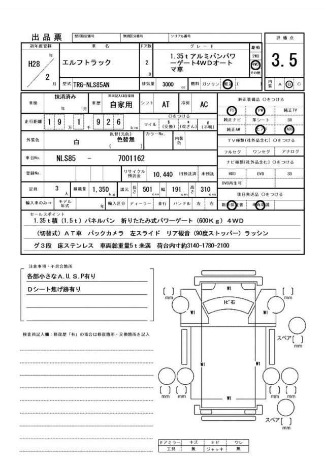 1.35t積 全低床 パネルバン パワーゲート(600Kg)4WD(切り替え式)オートマ車 バックカメラ 左スライドドア リア観音(90度ストッパー付)ラッシング3段 荷台床ステンレス 中古ホイル付きスタッドレスタイヤ有り 車両総重量5t未満