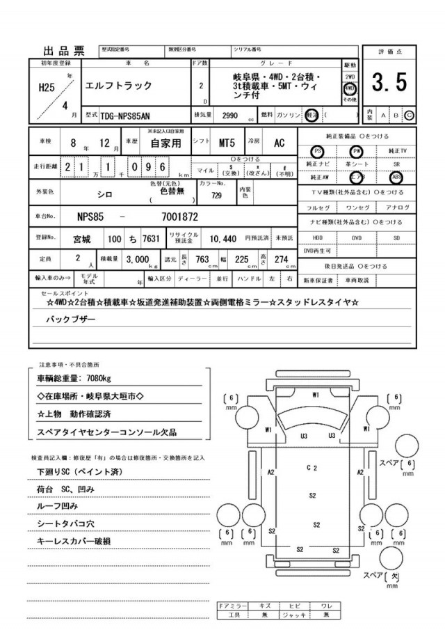 スペアタイヤセンターコンソール欠品・下廻りSC(ペイント済)・荷台 SC、凹み・ルーフ凹み・シートタバコ穴・キーレスカバー破損
