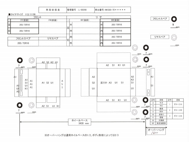 ▲フロントガラス:飛石キズ小 ▲外装各所:キズ小・サビ小・エクボ小 ▲フロアマット欠品・フロアシート擦れ・穴小 ▲運転席・助手席:シート擦れ・ヘタリ小・汚れ小 ▲ハンドル・シフト・ペダル:擦れ小 ▲左右サイドバンパー:キズ小・サビ小・曲り小 ▲テールレンズ:くすみ小 ▲下廻り・マフラー・シャーシ:サビ小 ▲床板:キズ・擦れ・反り小・タイヤ積込跡 ※他、詳細はお問い合わせください