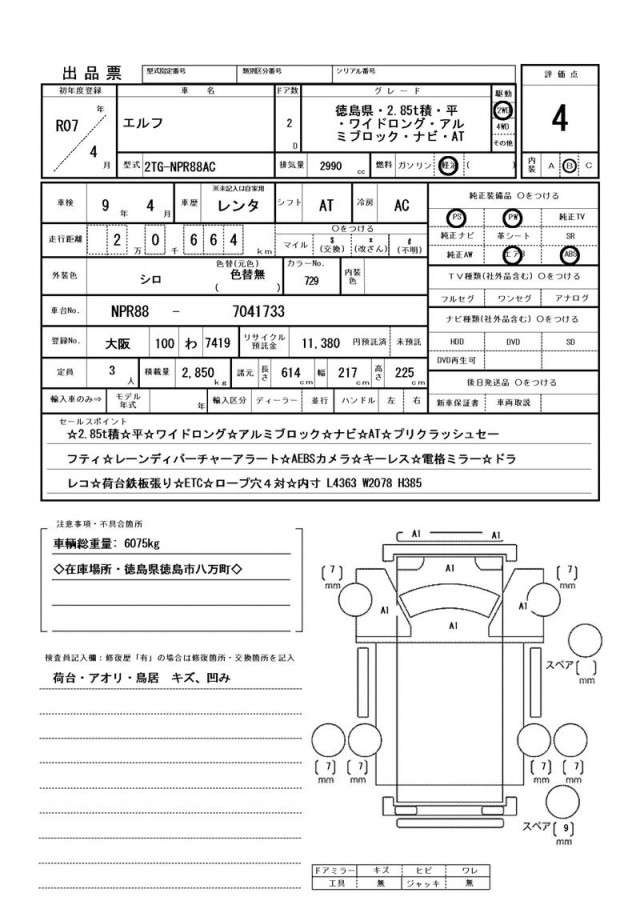 ☆2.85t積☆平☆ワイドロング☆アルミブロック☆ナビ☆AT☆プリクラッシュセーフティ☆レーンディパーチャーアラート☆AEBSカメラ☆キーレス☆電格ミラー☆ドラレコ☆荷台鉄板張り☆ETC☆ロープ穴4対☆内寸 L4363 W2078 H385