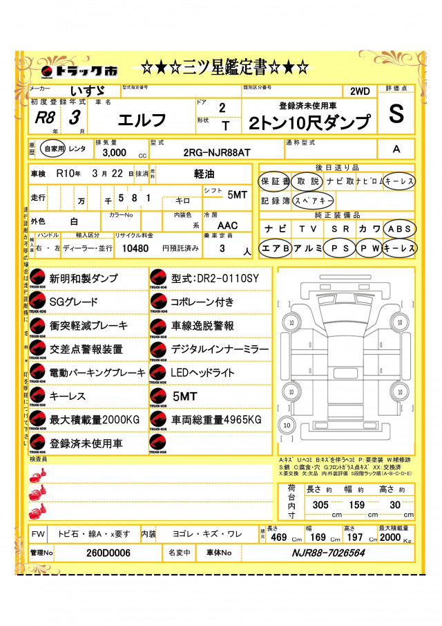 2トン10尺ダンプ SGグレード コボレーン付き 衝突軽減ブレーキ 車線逸脱警報 交差点警報 バックモニター LEDヘッドライト キーレス 6MT 登録済未使用