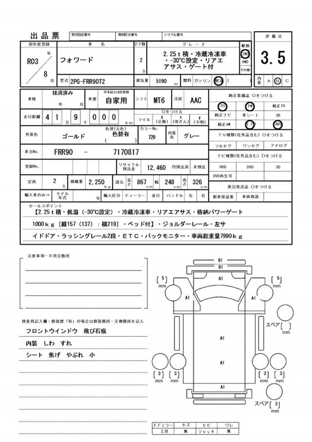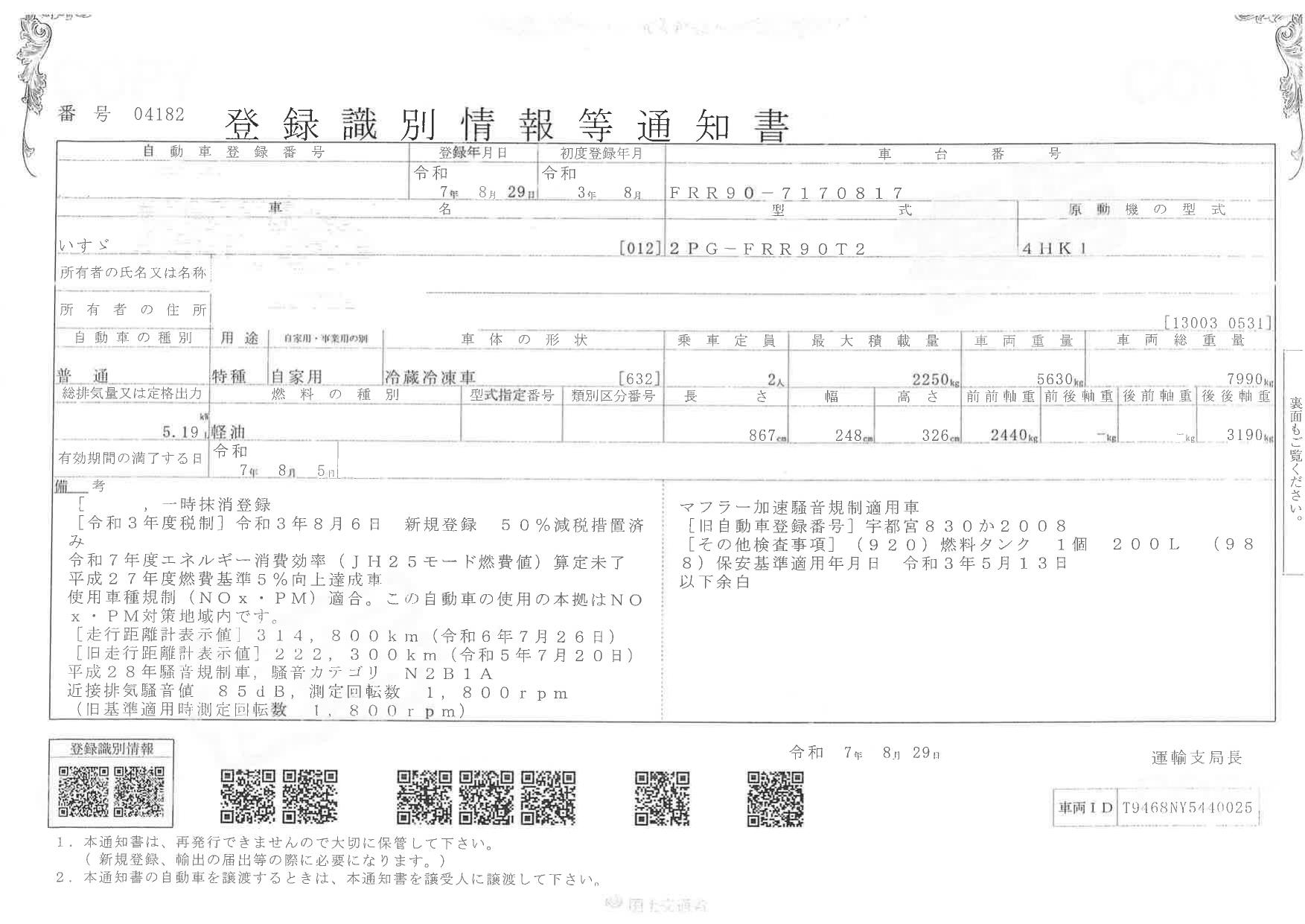 【2.25t積・低温(-30℃設定)・冷蔵冷凍車・リアエアサス・格納パワーゲート1000kg[縦157(137):横219]・ベッド付】・ジョルダーレール・左サイドドア・ラッシングレール2段(51:111cm)・ETC・バックモニター・集中ドアロック・左電格ミラー・車両総重量7990kg