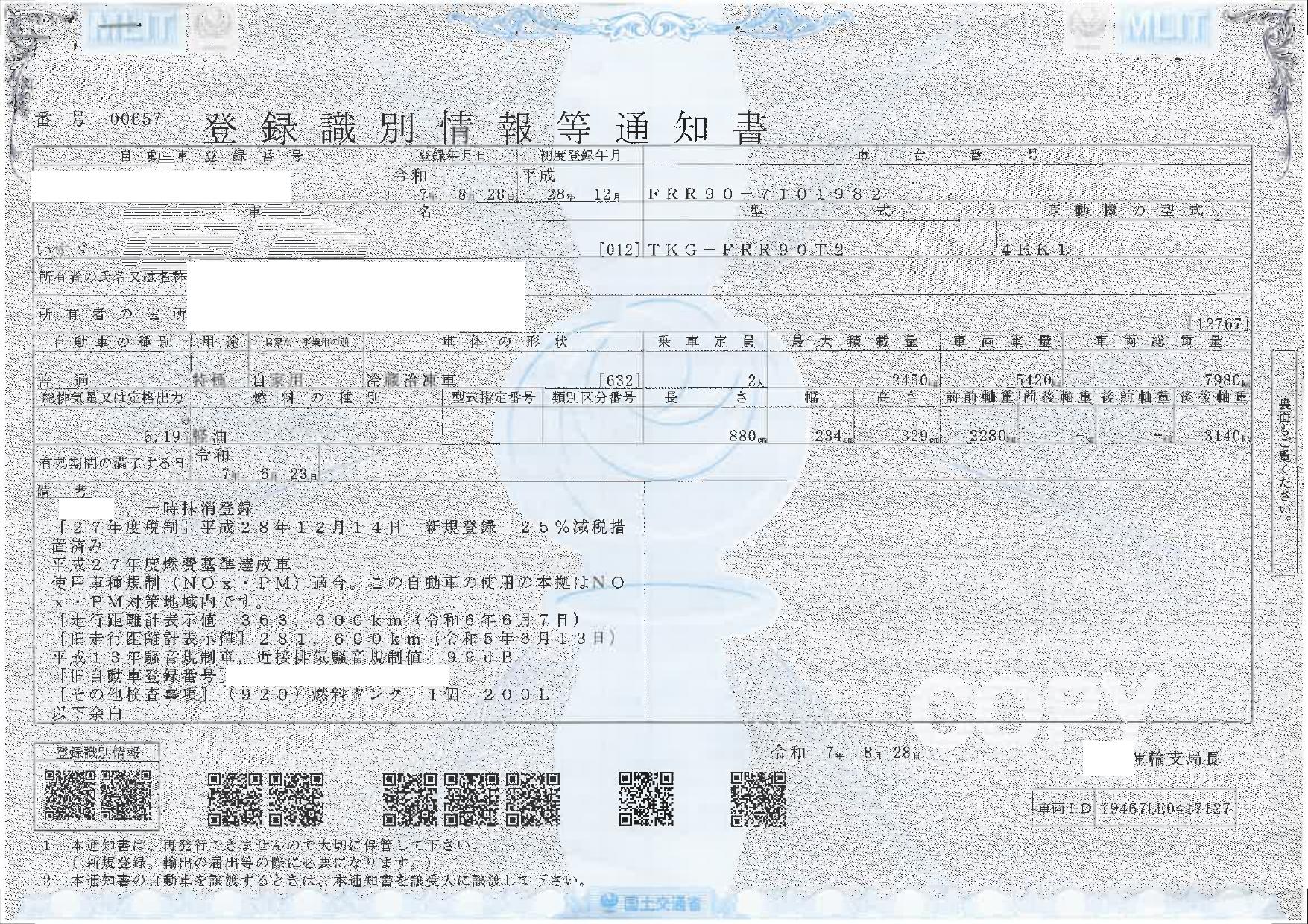 ※抹消車両は、登録時最大積載量が減トンされる可能性が御座います。