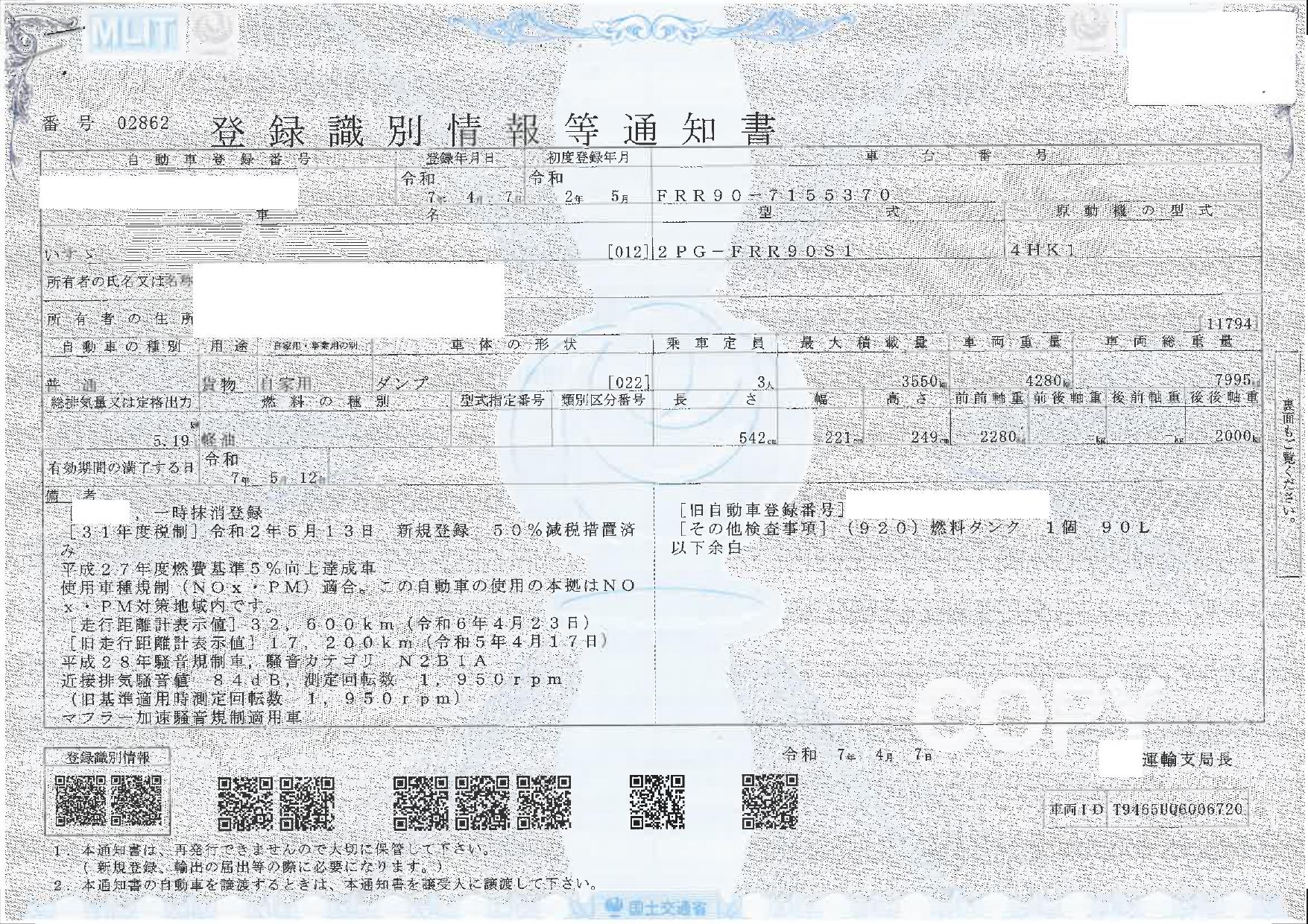 ※抹消車両は、登録時最大積載量が減トンされる可能性が御座います。