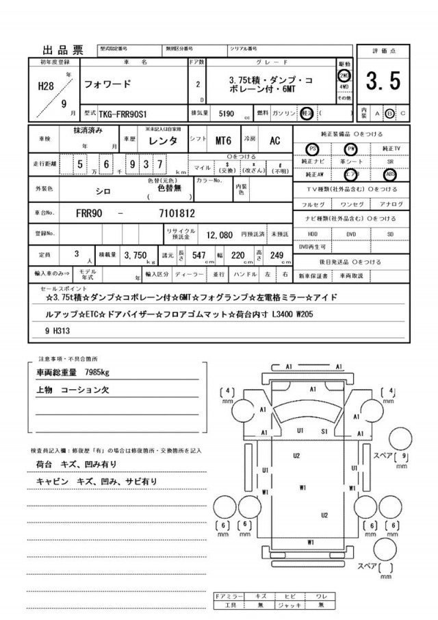 ☆3.75t積☆ダンプ☆コボレーン付☆6MT☆フォグランプ☆左電格ミラー☆アイドルアップ☆ETC☆ドアバイザー☆フロアゴムマット☆荷台内寸 L3400 W2059 H313