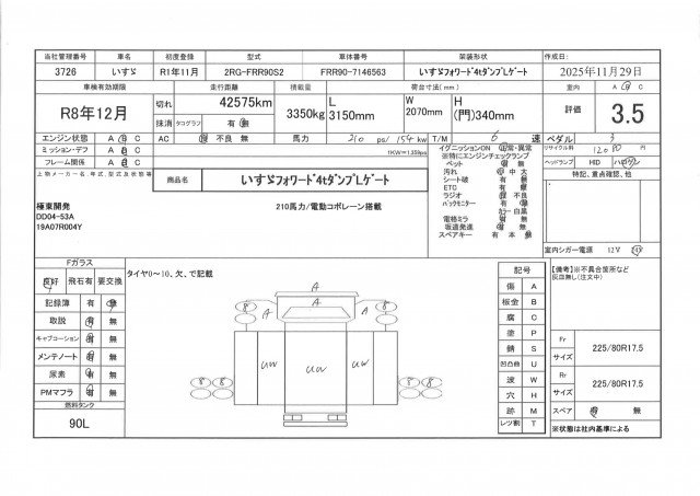 いすゞフォワード 4tLゲートダンプ 極東開発製 型式:DD04-53A 積載3350kg 電動コボレーン付 210馬力 低走行車