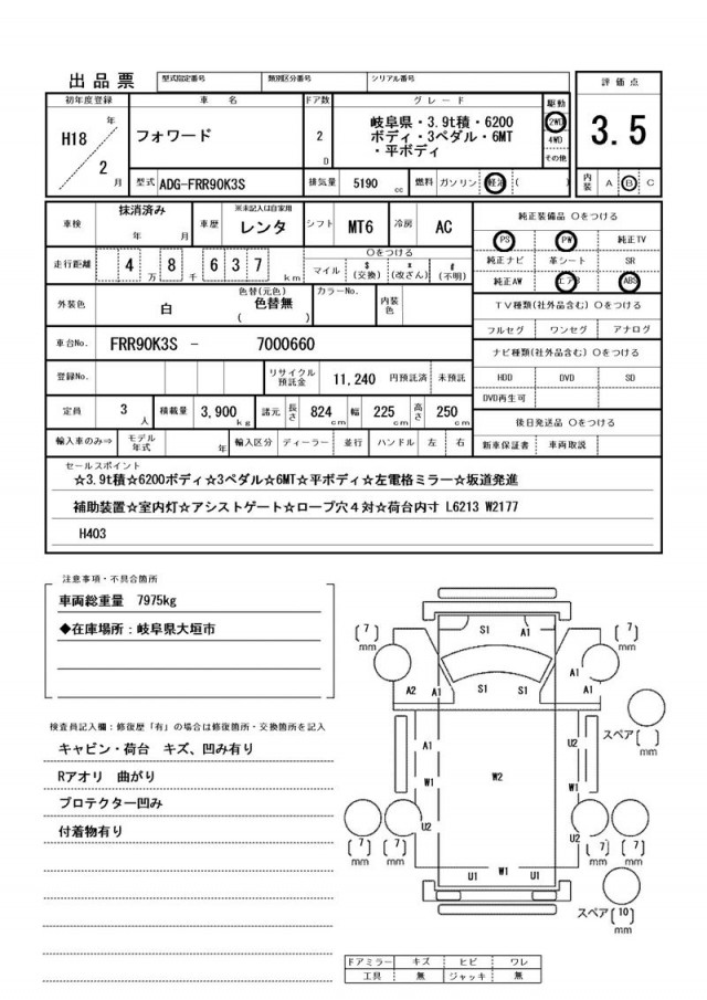 ☆3.9t積☆6200ボディ☆3ペダル☆6MT☆平ボディ☆左電格ミラー☆坂道発進補助装置☆室内灯☆アシストゲート☆ロープ穴4対☆荷台内寸 L6213 W2177 H403
