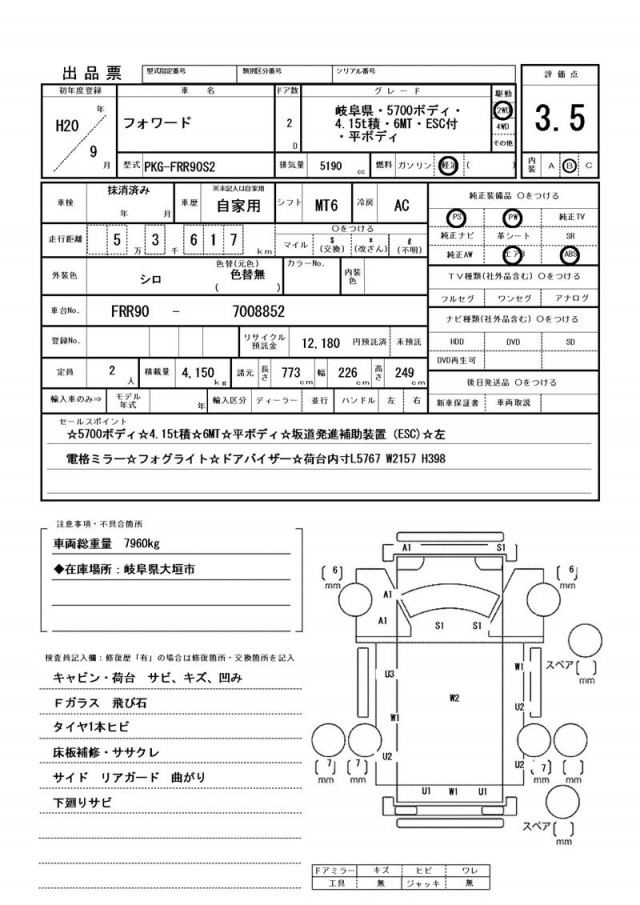 キャビン・荷台 サビ、キズ、凹み・Fガラス 飛び石・タイヤ1本ヒビ・床板補修・ササクレ・サイド リアガード 曲がり・下廻りサビ