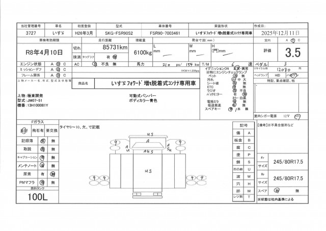 ★車検付★ いすゞフォワード 増t脱着式コンテナ専用車 極東開発製 型式:JM07-51 積載6100kg 可動式バンパー 210馬力 ETC付 ベッド 坂道発進補助装置 走行9万km以下 シフト6速MT
