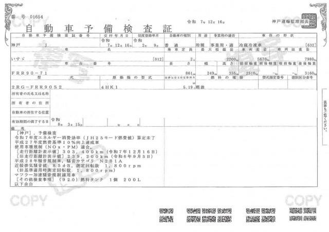 ▲フロントガラス:飛び石キズ小複数 ▲左ドアウインカーランプ:レンズにスリキズ▲運転席シート:表面擦れ、ガタあり ▲エンジン:オイル汚れ小▲クラッチ:ジャダー音小(カタカタ音) ▲シャーシ・下回り:サビ跡小 ▲マフラー:サビ ◆一時抹消のため、次回登録時に減トンの可能性があります。直近の予備検査取得時は、最大積載量2.2トンです。※他、詳細はお問い合わせください