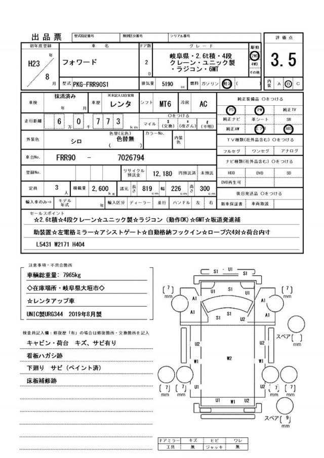 キャビン・荷台 キズ、サビ有り・看板ハガシ跡・下廻り サビ(ペイント済)・床板補修跡