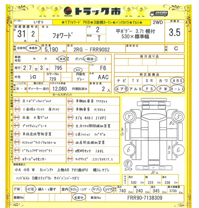 ☆平ボディー☆造りボディアルミブロック☆三面幌カーテン付/庫内灯☆530×標準幅☆17フォワード☆床面木製デッキ☆左右あおり開閉補助装置☆プリクラッシュブレーキ☆車線逸脱警報☆坂道発進補助装置☆HIDヘッドライト☆アルミホイール☆ドライブレコーダー☆タコグラフ☆カラーバックモニター☆車両取説☆3700kg