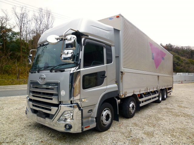 いすゞ・4軸低床・後輪エアサスのアルミウイングが入荷いたしました! ミッションはスムーサーGの3ペダルでエンジンは380馬力です。 荷台内寸は(L=9.60m、W=2.41m、H=2.64m、門高=2.54m)で積載量は13,800㎏とれておりました。 庫内にはラッシングレールが2対・引き出しフック9対ついております。 バックアイカメラ付きですので駐車等も楽々です。 安価な設定となっておりますので新車等のつなぎにいかがでしょうか?