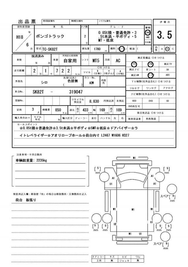 ☆0.85t積☆普通免許☆3.5t未満☆平ボディ☆5MT☆低床☆ドアバイザー☆ライトレベライザー☆アオリロープホール☆荷台内寸 L2467 W1606 H327