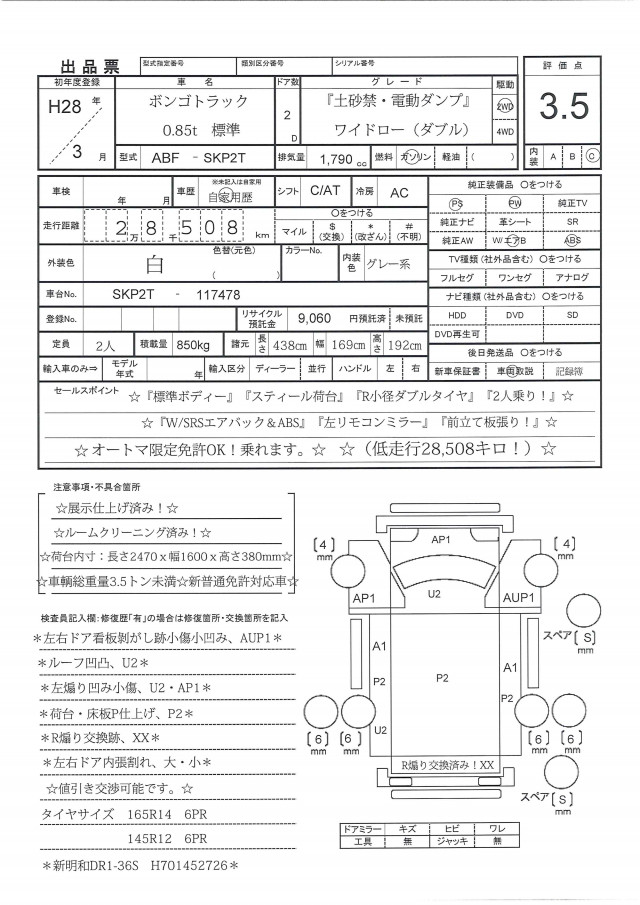 ☆H28年ボンゴトラック0.85t標準ワイドロー(ダブル)『土砂禁・電動ダンプ』スティール荷台・2人乗り!(低走行28,508キロ!)『W/SRSエアバック&ABS』『左リモコンミラー』☆車輌総重量3.5トン未満☆新普通免許対応車☆オートマ限定免許OK!乗れます。☆遠方の方でも安心!ルームクリーニング済み!☆展示仕上げ済み!☆