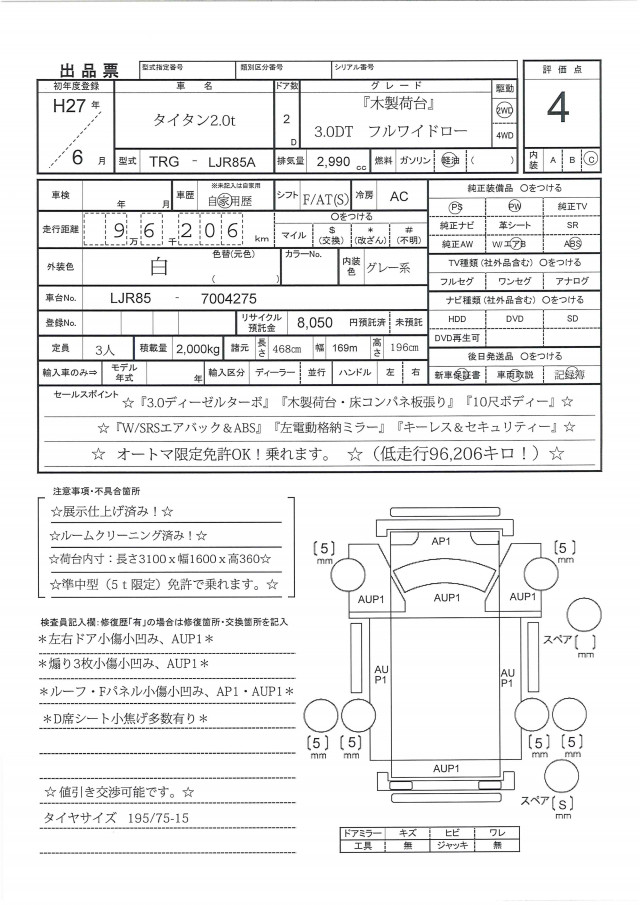 ☆H27年タイタン2.0tフルワイドロー『10尺ボディー』木製荷台・床コンパネ板張り!☆(低走行96,206キロ!)『W/SRSエアバック&ABS』『左電動格納ミラー』『キーレス&セキュリティー』☆準中型(5t限定)免許で乗れます。☆オートマ限定免許OK!乗れます。☆遠方の方でも安心!ルームクリーニング済み!☆展示仕上げ済み!☆