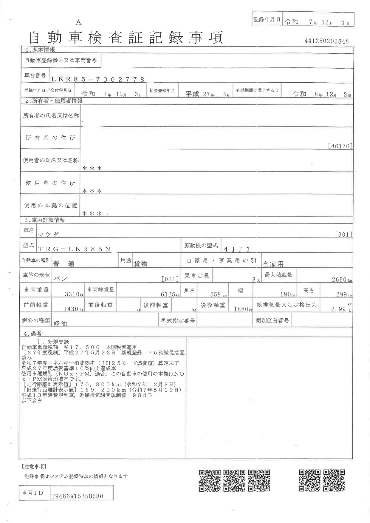 | 走行距離 | 171,000(km) |
