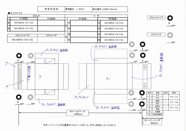 ▲フロントガラス:飛石キズ微小 ▲サイドミラーカバー:擦りキズ ▲キャビン外装:キズ小、凹み小、タッチペン、看板跡 ▲キャビン内装:擦りキズ、フロアシート破れ、ハンドル擦れ ▲運転席シート:一部破れ小 ▲左ドア内側下部:凹み▲下回り・シャーシ:一部サビ小、サビ跡、マフラーにサビ ▲プレス板:キズ・サビ跡、凹み小▲排出板:キズ・サビ跡、一部凹み・浅い反り▲汚水タンク:下部にキズ跡、凹み小