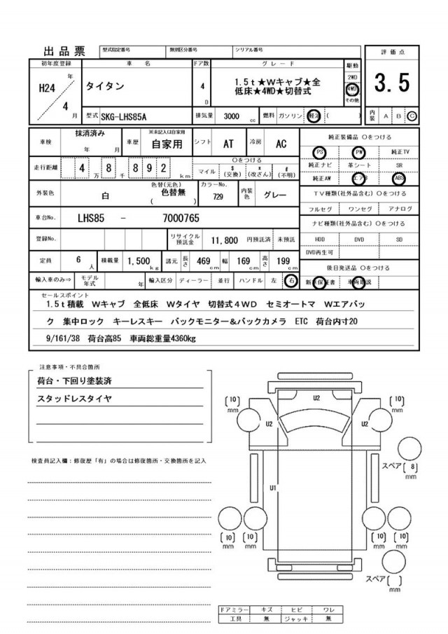 1.5t積載 Wキャブ 全低床 Wタイヤ 切替式4WD セミオートマ Wエアバック 集中ロック キーレスキー バックモニター&バックカメラ ETC 荷台内寸209/161/38 荷台高85 車両総重量4360㎏