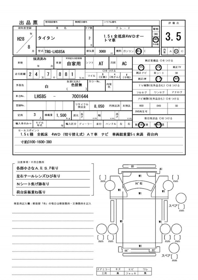 1.5t積 全低床 4WD(切り替え式)AT車 ナビ 車両総重量5t未満