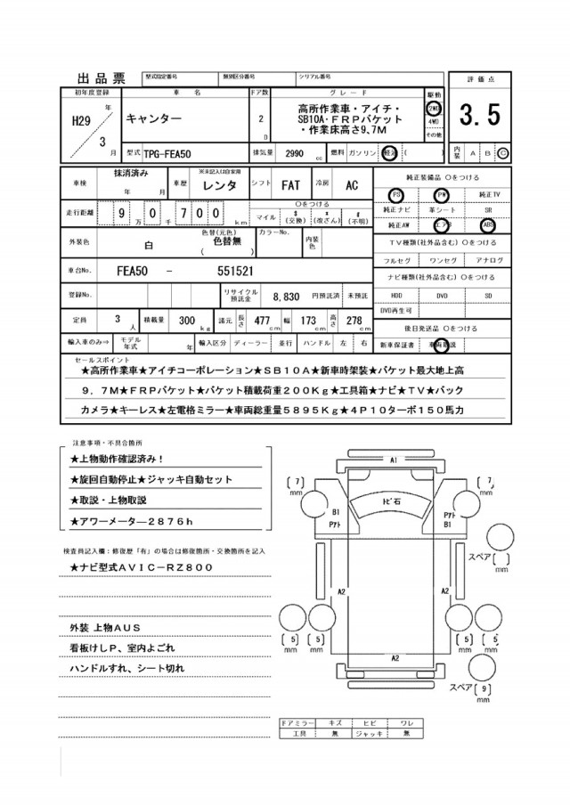 ★高所作業車★アイチコーポレーション★SB10A★新車時架装★バケット最大地上高9,7M★FRPバケット★バケット積載荷重200Kg★工具箱★ナビ★TV★バックカメラ★キーレス★左電格ミラー★車両総重量5895Kg★4P10ターボ150馬力★上物動作確認済み!★旋回自動停止★ジャッキ自動セット★アワーメータ―2876h★ナビ型式AVIC-RZ800★取説・上物取説