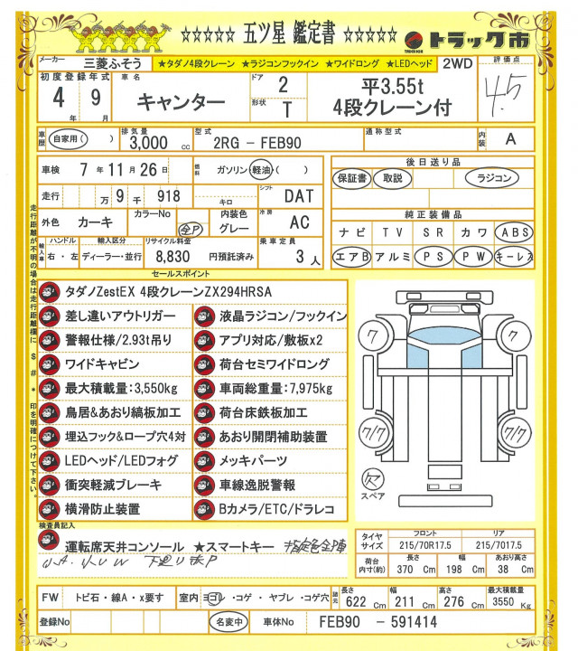 ☆4段クレーン☆平☆液晶ラジコン☆フックイン☆ワイドキャビン☆荷台セミワイドロング☆LEDヘッド☆差し違いアウトリガー☆警報仕様/2.93t吊☆アプリ対応/敷板×2☆鳥居&あおり縞板加工☆荷台床鉄板☆埋込フック&ロープ穴4対☆あおり開閉補助装置☆衝突軽減ブレーキ☆車線逸脱警報☆横滑防止装置☆坂道発進補助装置☆バックカメラ/ETC/ドライブレコーダー☆スマートキー☆運転席天井コンソール