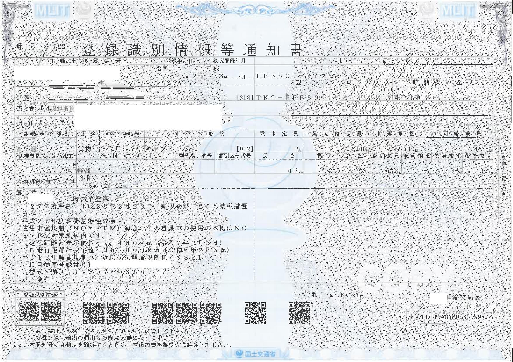 ※抹消車両は、登録時最大積載量が減トンされる可能性が御座います。